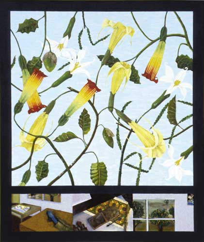 "One of my main interests as a painter is the study of shamanic practices, both historically and in contemporary times. Using the history of shamanism as source material allows me to examine the roles of plants in cultures of the past, and I use these ideas to explore and clarify the relationship of inebriating plants to our own culture." -- Donna Torres